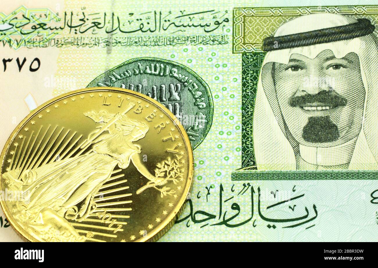 A Macro Image Of A Green One Saudi Riyal Bank Note With A Gold Coin Shot Close Up Stock Photo Alamy